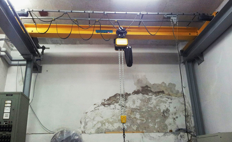 Der Brückenkran hat eine Traglast von 5000 kg und ist in allen 3 Achsen elektrisch verfahrbar. Als Hubeinheit wurde ein Elektrokettenzug gewählt, da die wöchentliche Einschaltdauer sehr gering ist. Mittels eines unabhängig von der Katze laufenden Steuerschalters sind alle Transportwege sehr gut einsichtbar. Dies bietet dem Bediener optimale Sicherheit.