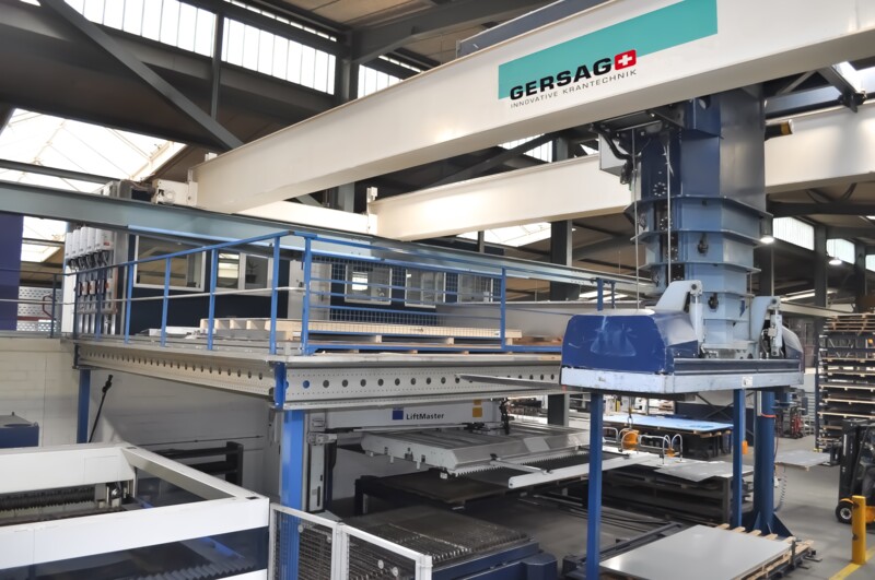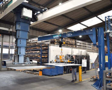 Für die Dettwiler AG haben wir eine smarte innerbetriebliche Logistiklösung rund um die Blechstrasse realisiert. Ein 3.2 t Stapelkran und ein 270° - Säulenschwenkkran mit selbstsaugender Vakuumaufnahme machen das Rüsten von ganzen Paletten und Einzelplatten für die Flachbettlaseranlage effizient.