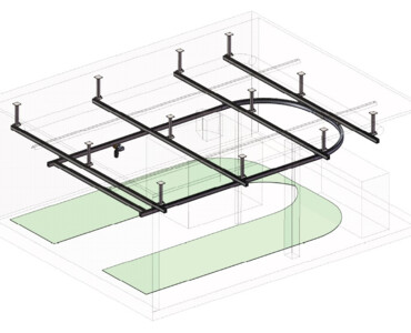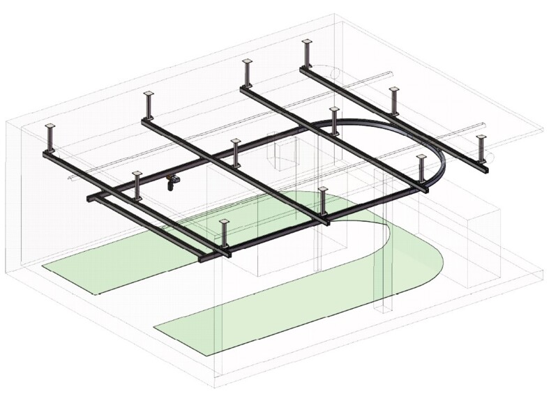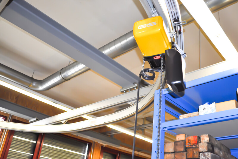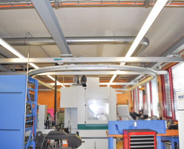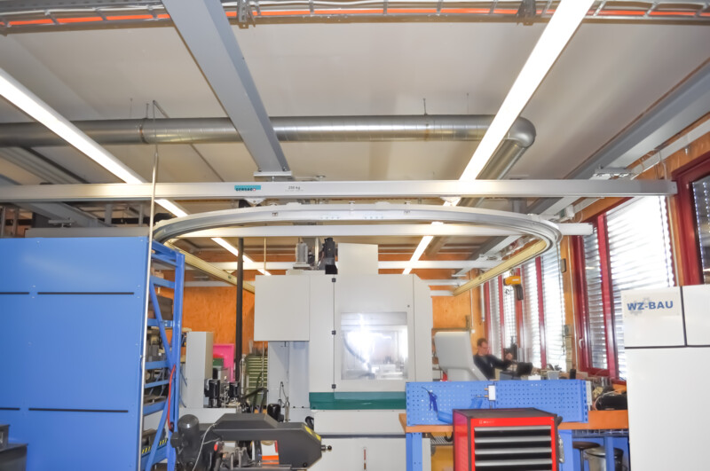 Die Konstruktion und Planung waren jedoch eine echte Herausforderung: Die bestehende Infrastruktur sollte nicht aufwendig angepasst werden. Ein mittiges Hindernis von der Decke aus versperrt den Fahrweg. Und doch sollen alle Maschinen und Werkbänke angefahren werden können.