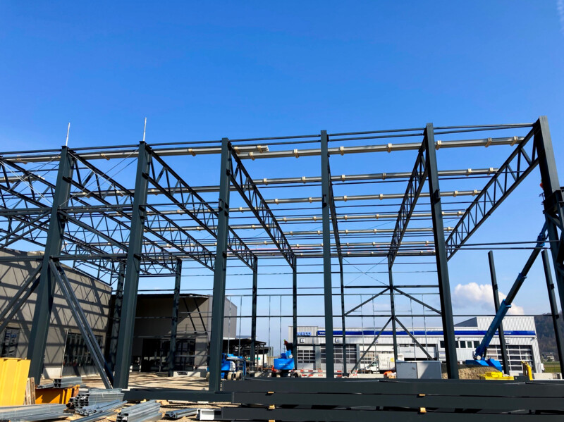 Mit dem Bau der dritten Halle haben wir zusätzlich 3'000 m2 Produktionsfläche gewonnen. Unsesre neue Halle ermöglicht einen fliessenden Produktionsprozess von der Trägerbearbeitung über Lackierung bis hin zur Endmontage. Ausserdem wird die Blechbearbeitung zukünftig Inhaus gemacht.