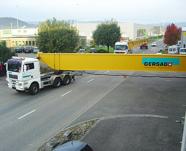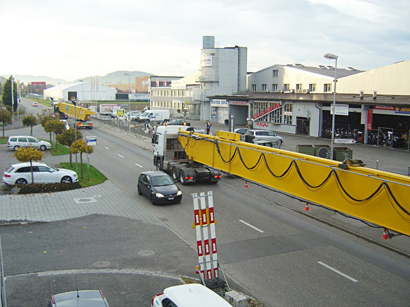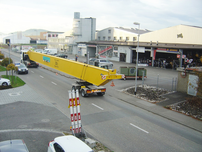 Heute Morgen wurden die beiden Kranbrücken für einen weiteren Zweiträger-Brückenkran mit einer Traglast von 32t ausgeliefert. Der Transport wurde im Konvoi mit zwei LKW´s durchgeführt. Wegen der Überlänge der beiden Kranbrücken war eine Polizeibegleitung nötig. Die beiden Kranbrücken haben ein Eigengewicht von je rund 18.5t. Der Kran wurde von der Firma Moser Maschinen und Immobilien AG bestellt. Am selben Standort und auf derselben, rund 250m langen Kranbahn wurden letztes Jahr bereits zwei Krane installiert. Der erste Kran hat eine Traglast von 25t. Der zweite Kran hat zwei Hubwerke mit jeweils 15t, also insgesamt 30t Traglast. Ergänzt wird die Anlage nun mit dem dritten Kran, welcher 32t Traglast hat.