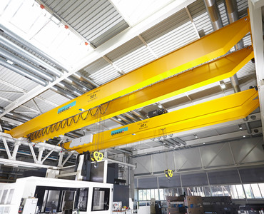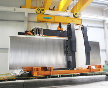 Zum Gesamtkonzept des neuen 5-Achs-Portalbearbeitungscenter für Grossteile mit 3 Tischen bis 75 t - Werkstücke bis L 18 m / B 3,5 m / H 3 m gehören die von GERSAG gelieferten 2 x 30 Tonnen Zweibrückenkrane. Mit einer Spannweite von rund 24 Meter bilden die zwei Kranbrücken das Bindeglied zum Bearbeitungscenter. So können die drei Bearbeitungstische effizient und sicher be- und entladen werden. Durch den optimalen Materialfluss kann das Bearbeitungscenter maximal ausgelastet werden.