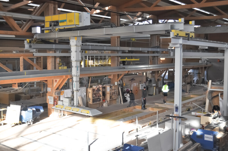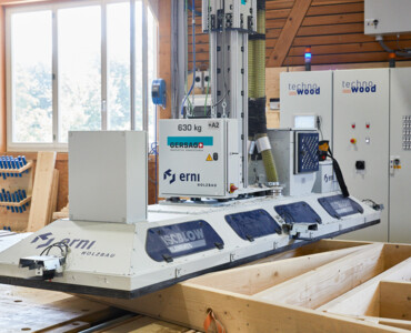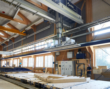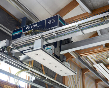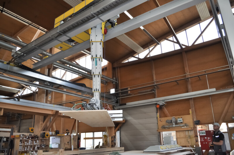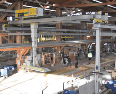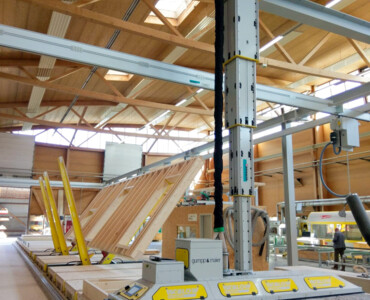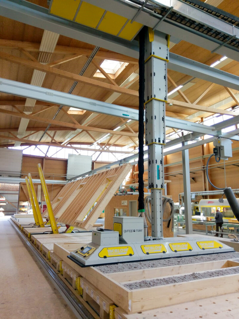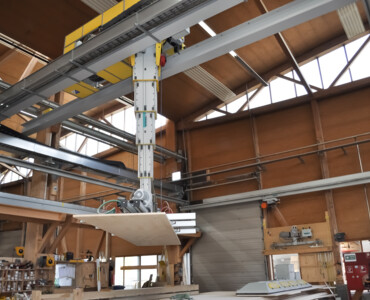 MehrKarin ist das effiziente Multitalent rund um hochautomatisierte Produktionsstrassen im Holzelementbau. Der Stapelkran wird zum präzisen Einblasen von Dämmmaterial in Holzelemente verwendet. Mit der Wechselvorrichtung mit Vakuumaufnahme werden anschliessend Deckplatten im Handumdrehen auf dem Holzelement platziert. Der Karin-Kran ist die optimale Ergänzung für die Produktionsstrasse rund um einen Elementroboter.