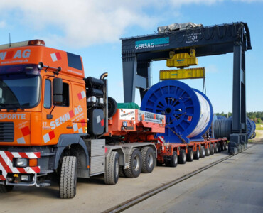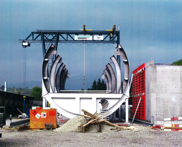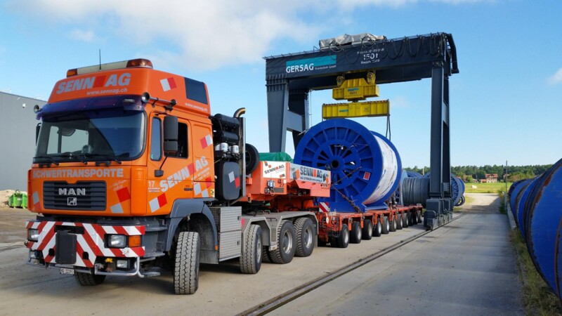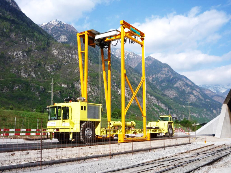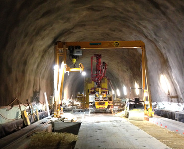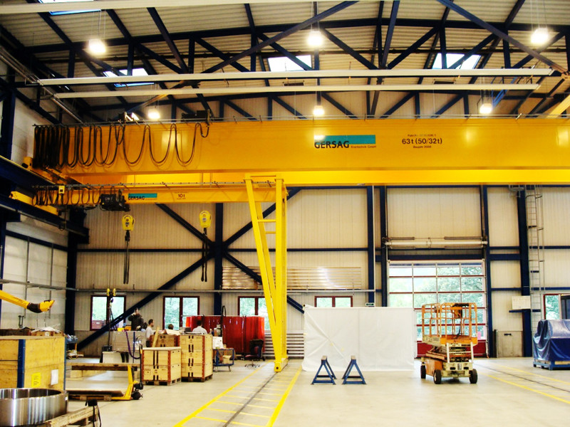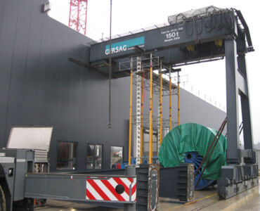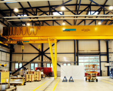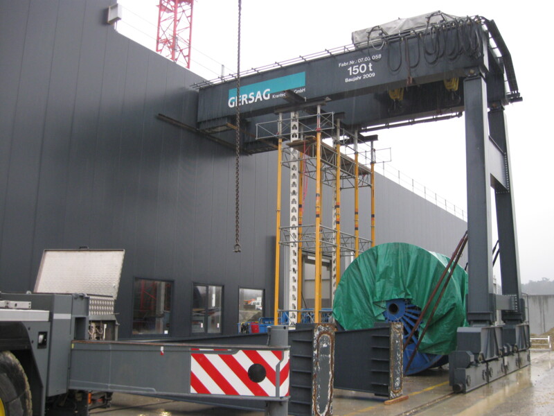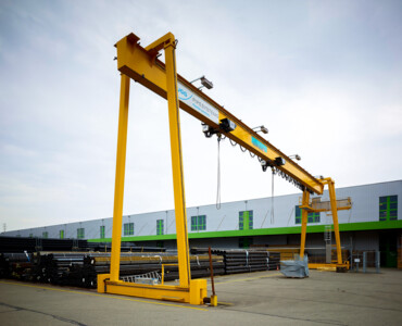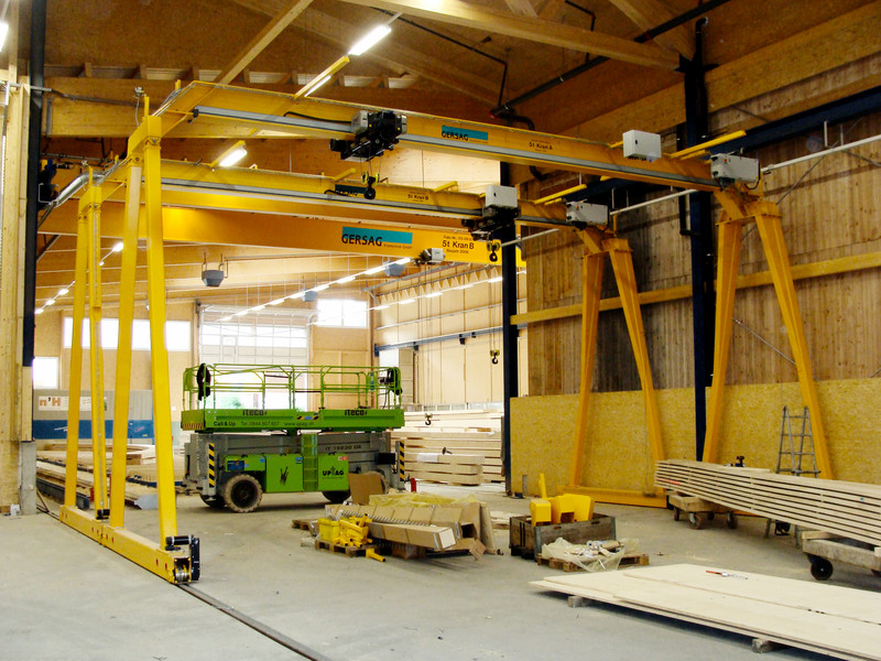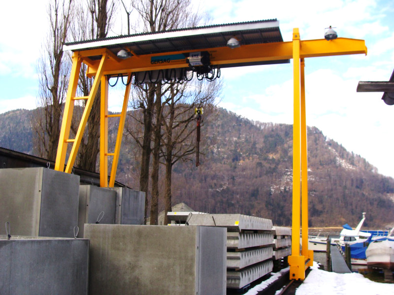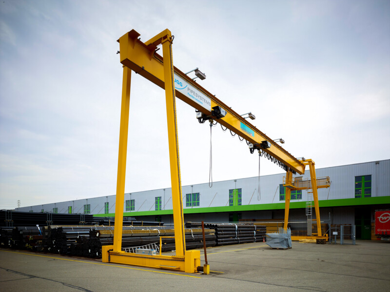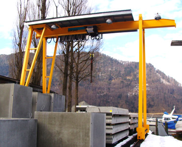 Der Portalkran fährt auf dem Boden, wobei die Kranbrücke auf den mitfahrenden Portalstützen aufliegt. Er ist ebenfalls als Einträger- oder Zweiträger-Ausführung realisierbar. Portalkrane haben besonders bei Aussenanlagen den Vorteil, dass keine Stahlbauten wie Stützen und Kranbahnen nötig sind – das macht ihn entsprechend kostengünstiger. Und je nach Schienenausführung kann die Kranschiene beispielsweise mit LKW’s überfahren werden. Allerdings muss die Gefahrenzone entlang der Fahrgasse des Kranfahrwerkes und der mitfahrenden Portalstütze mit Sicherheitsmassnahmen ausgerüstet werden.