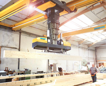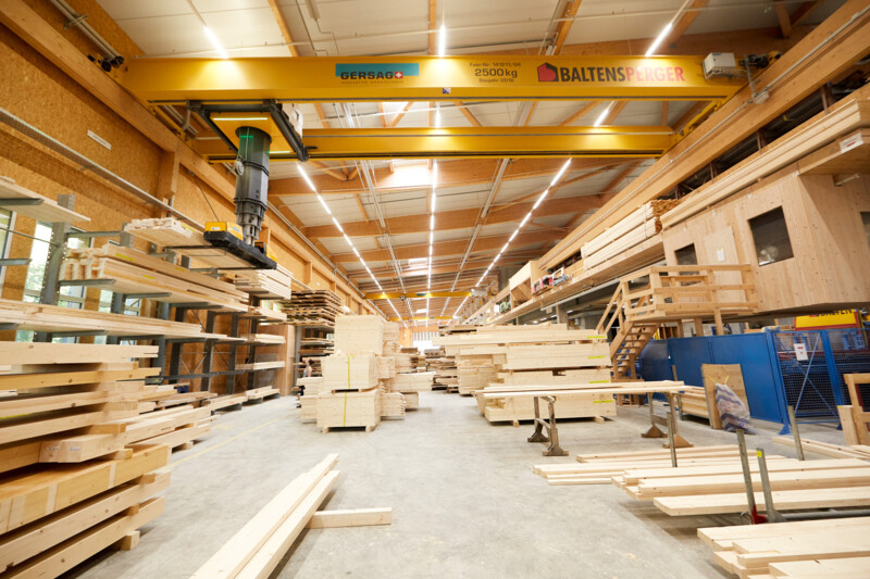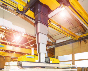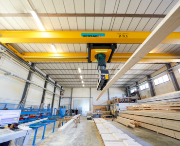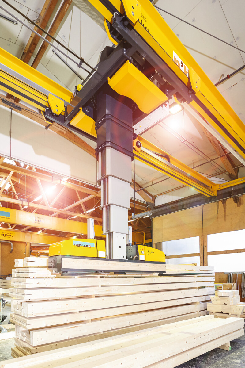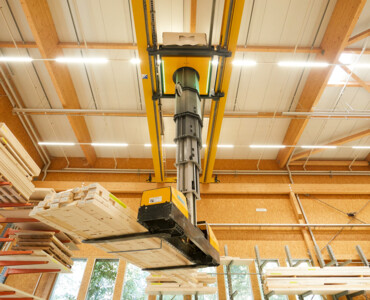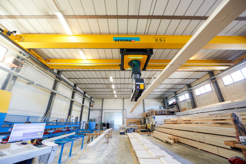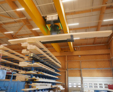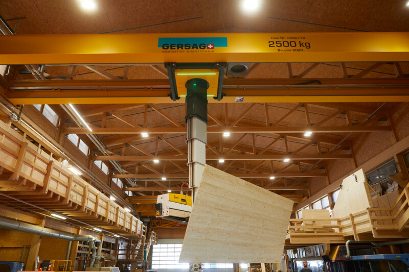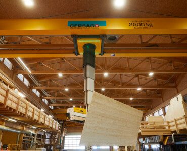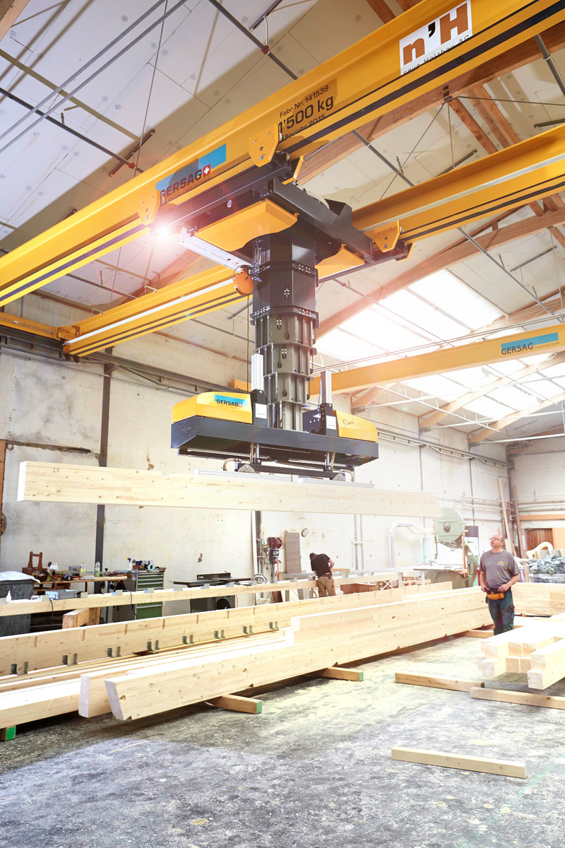 Die Alpiger Holzbau AG in Sennwald setzt für die Bestückung der Abbundmaschine und das Wenden auf einen Gersag Stapelkran. Der Einträger-Brückenkran unterstützt beim Befüllen der Bauteile. Der Prozess wird mit einem Schlauchheber für ein einfaches Plattenhandling abgerundet.