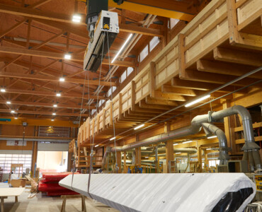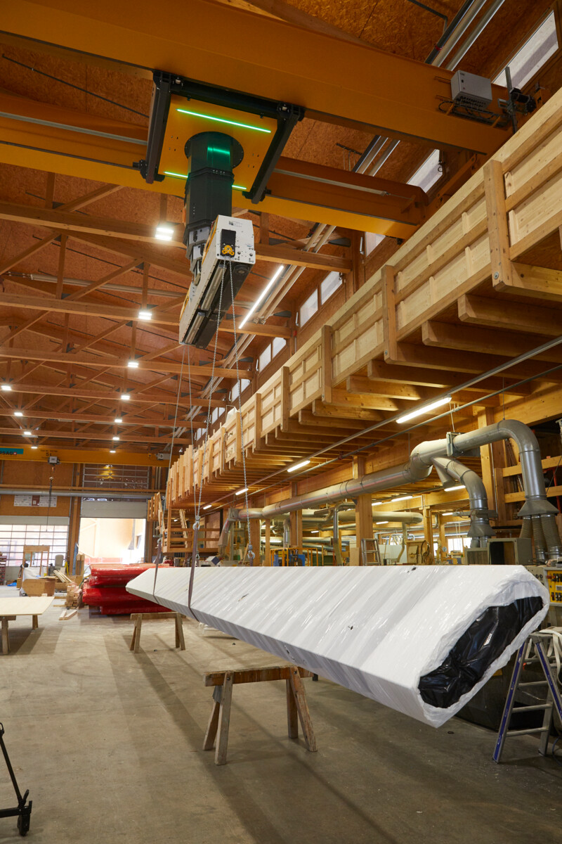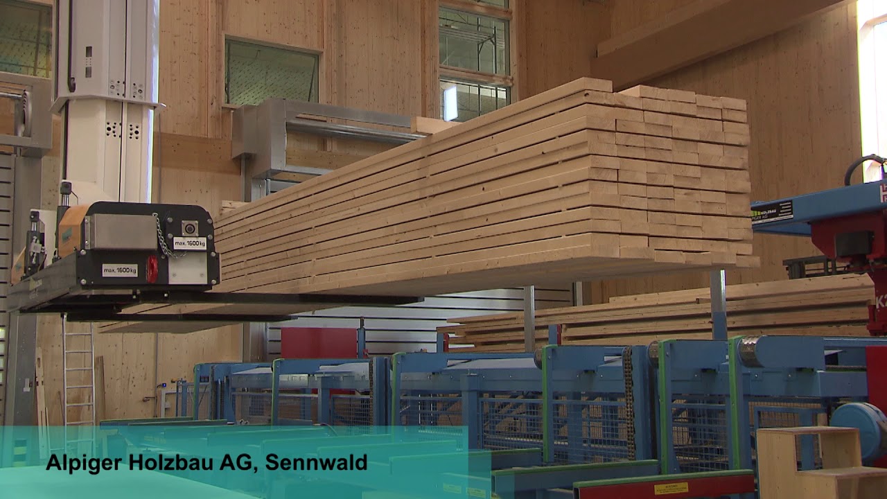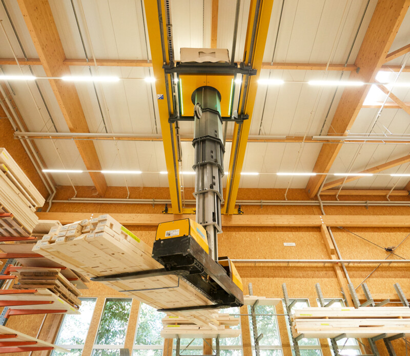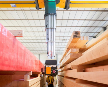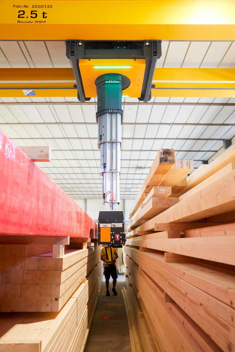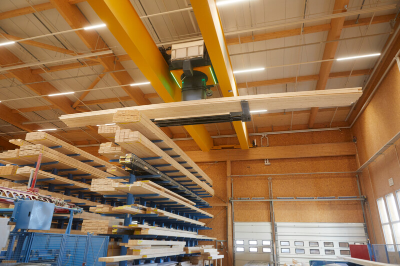Die Alpiger Holzbau AG in Sennwald setzt für die Bestückung der Abbundmaschine und das Wenden auf einen Gersag Stapelkran. Der Einträger-Brückenkran unterstützt beim Befüllen der Bauteile. Der Prozess wird mit einem Schlauchheber für ein einfaches Plattenhandling abgerundet.