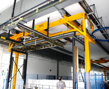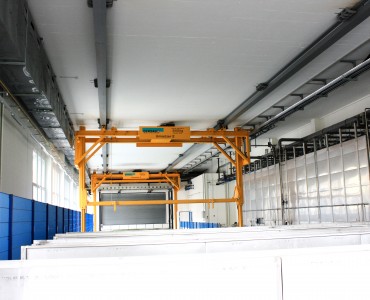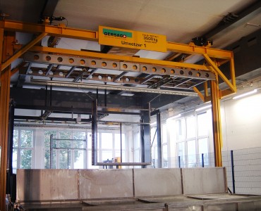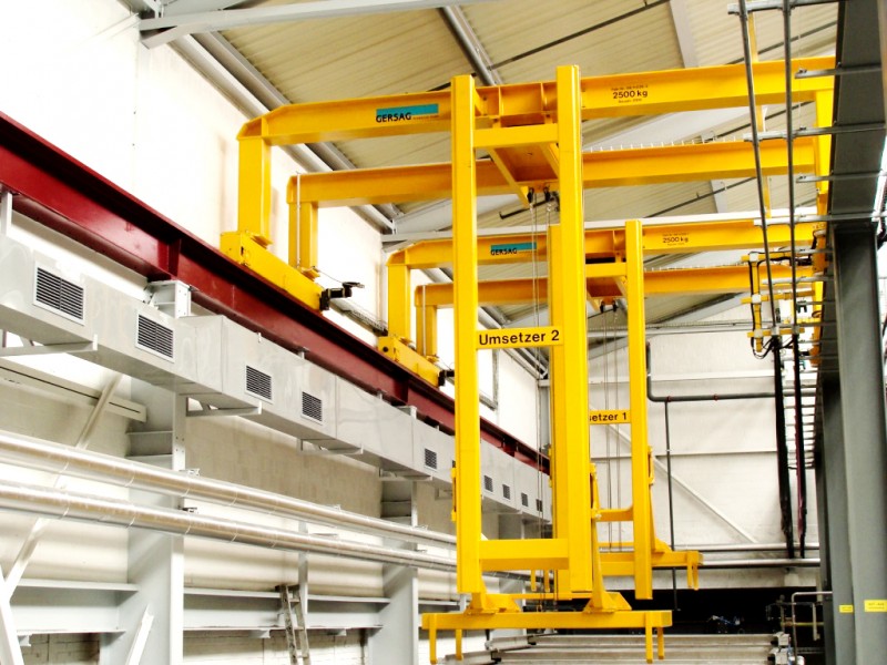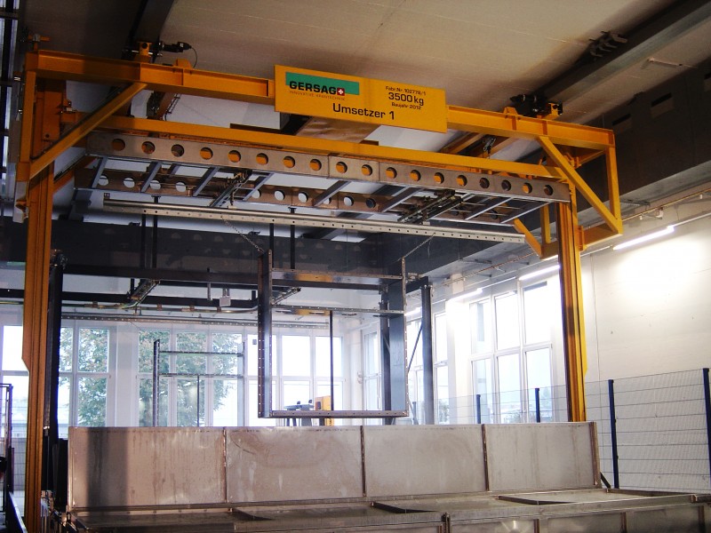 Anwendung finden solche Anlagen zum Beispiel in der Oberflächenbehandlung, wobei der Umsetzer bestückte Gehänge nach verschiedenen Programmen durch unterschiedliche Bäder taucht und dort absetzt. Je nach Medium sind unterschiedliche Tauchzeiten gegeben, welche durch die vollautomatische Steuerung exakt eingehalten werden.