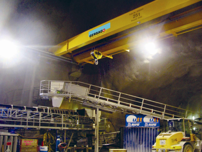 Die Konstruktion, Lieferung und Montage der sieben Einträger- und Zweiträger-Brückenkrane war eine logistische Herausforderung, da sämtliche Transporte mit einer Seilbahn vogenommen werden mussten und somit nur Längen von bis zu 15m möglich waren.