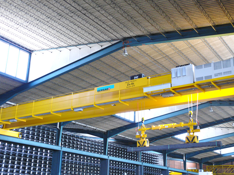 Über den Sägemaschinen installierte die Gersag im März 2012 drei Einträger-Brückenkrane 2 x 3.2t inklusive Kranbahn und Stützen. Mit diesen wird das automatisierte Regallager mit Profilen aus Edel- und Baustahl beschickt.