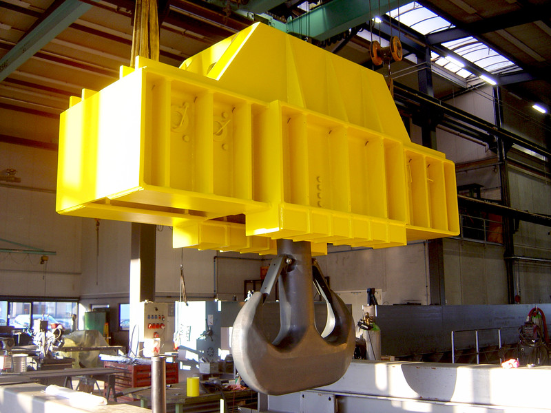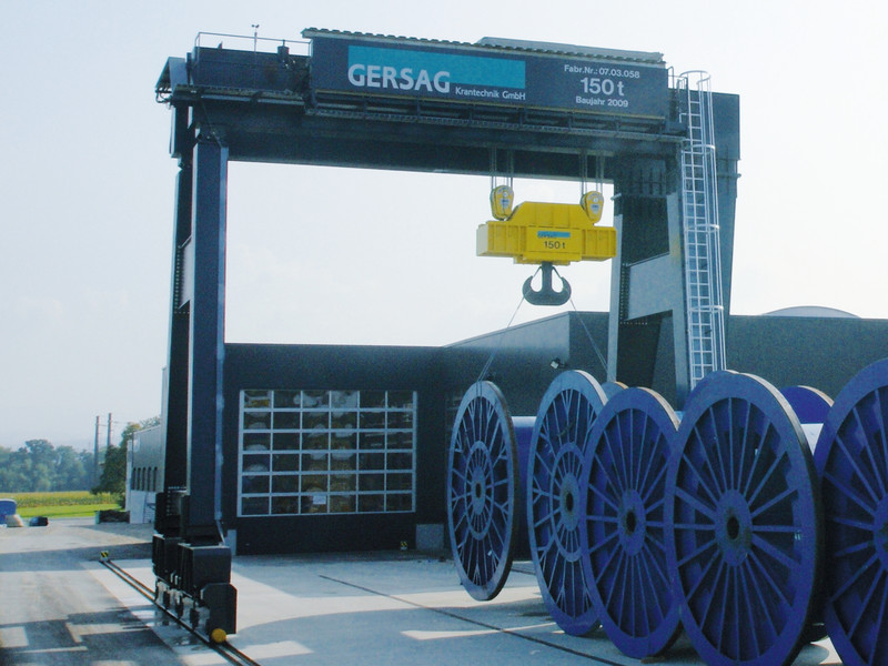 Mit ihrer neuen Tandem-Verseilmaschine stellt Fatzer Seilbobinen her, die bis zu 150t schwer werden. Für deren Handhabung wurde von der Firma GERSAG ein Portalkran mit der entsprechenden Tragfähigkeit entwickelt. Die Konstruktion wurde mit Hilfe von 3D CAD und FEM Berechnungsprogrammen erstellt und als Zweiträger-Portalkran in Kastenträgerbauart ausgeführt. Die Spannweite misst 9.55m und die Gesamthöhe beträgt 11.5m.