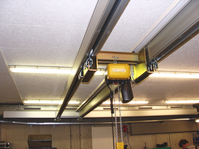 Die spezielle Kranbauart in der Mechanischen Werkstatt wurde nötig wegen der niedrigen Raumhöhe. Die geforderte Hakenhöhe des Kettenzuges wurde mittels einer Doppelbrücke und dem Zwischenbau erreicht. Die Kran-Konstruktion wurde mit Aluminium Profilen (Typ LIGHTster) ausgeführt, da damit das Transportgut in beiden Achsen von Hand, punktgenau gestossen und gezogen werden kann.