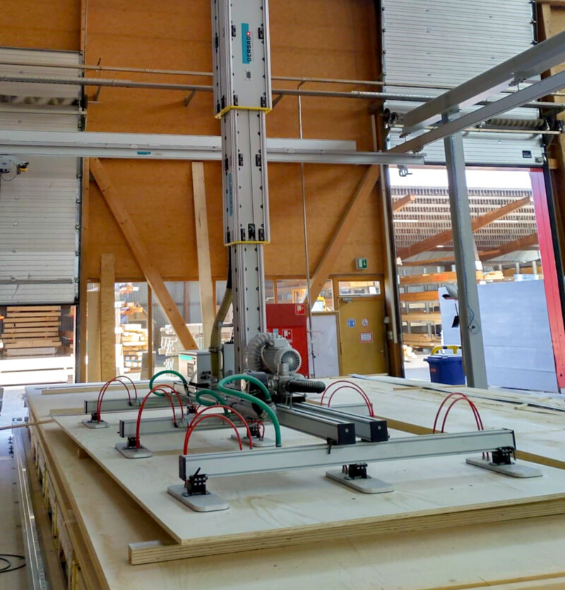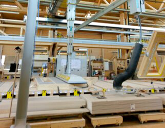 An ihrer neuen Fertigungslinie ist der Karin Stapelkran im Einsatz. Der Kran ist die passende Ergänzung zur Technowood Produktionsstrasse rund um den TW Milli-E Elementbauroboter. Während der Elementbauroboter Holzplatten, Brettschichtholz, ein oder mehrere Einzelstäbe effizient und präzise bearbeitet, sorgt Karin für die gesamte Logistik rund um die Anlage. Sie verfügt über eine Vakuumaufnahme und Vorrichtung für die Einblasplatte. So platziert sie das Material oder die Einblasplatte präzise mit Leichtigkeit auf der Produktionsstrasse.