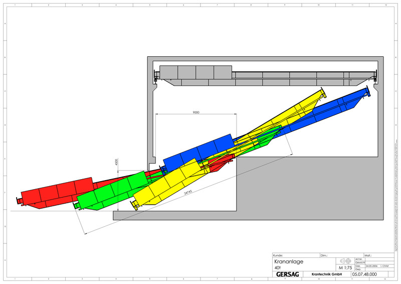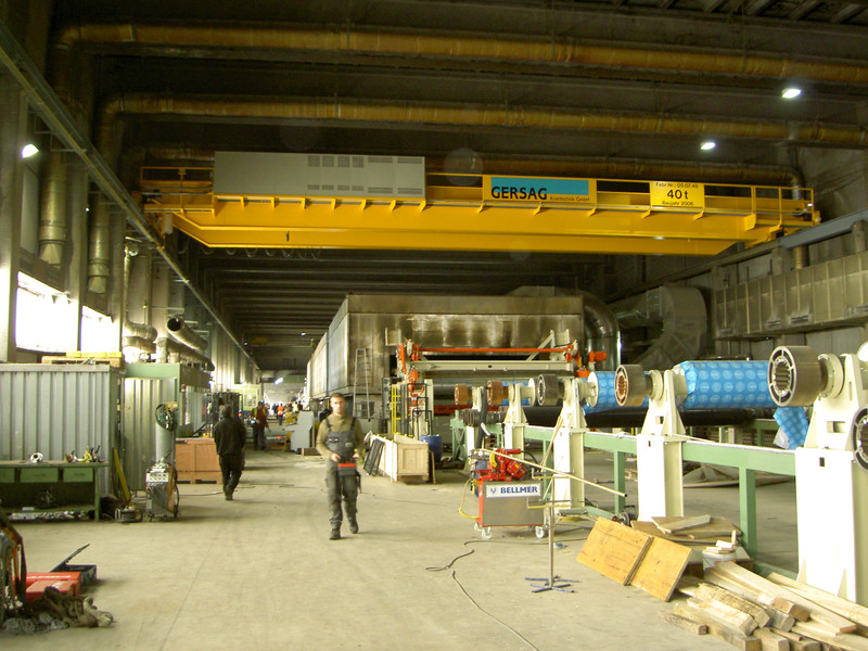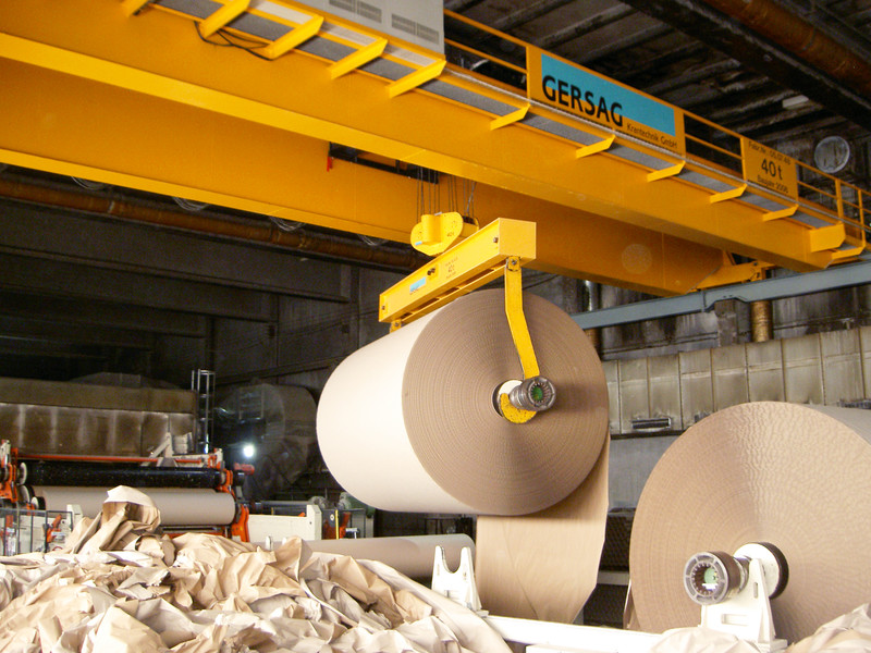 Die Kartonherstellung erfordert ein Drehen der 40t schweren Tambouren um 180º. Die GERSAG rüstete den neuen Kran mit einer elektrisch drehbaren Unterflasche aus. Alleine die drehbare Unterflasche mit Doppelhaken wiegt über 1 Tonne. Um dem Bediener das Drehen zu erleichtern, stoppt der Haken, durch Sensoren gesteuert, alle 90º Schritte.