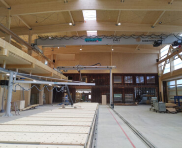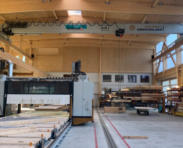 Für die Oberholzer GmbH in Eschenbach realisierte Gersag Krantechnik AG eine hocheffiziente Lösung für die innerbetriebliche Logistik. Die ganzen Anlagen sind verteilt auf drei Ebenen. Die Kranlösungen unterstützen standardisierte Abläufe rund um die Produktionsstrasse und den Elementbauroboter. Dabei wird höchste Flexibilität im Holzsystembau ermöglicht. Auf der oberen Ebene sorgt ein Einträgerbrückenkran mit zwei Katzen für den Hallentransport. In der mittleren Ebene kommt ein Halbportalkran mit Einblasplatte zum Einsatz, der die Holzbauelemente mit Dämmmaterial befüllt. Die untere Ebene wird durch Schlauchheber an Säulenschwenkkranen ergänzt, die punktuelle Platzierungen auf der Fertigungslinie erlauben. Dank dieser durchdachten Krantechnik kann die Oberholzer GmbH ihre Sortimentsbreite effizient abdecken – ein klarer Wettbewerbsvorteil!