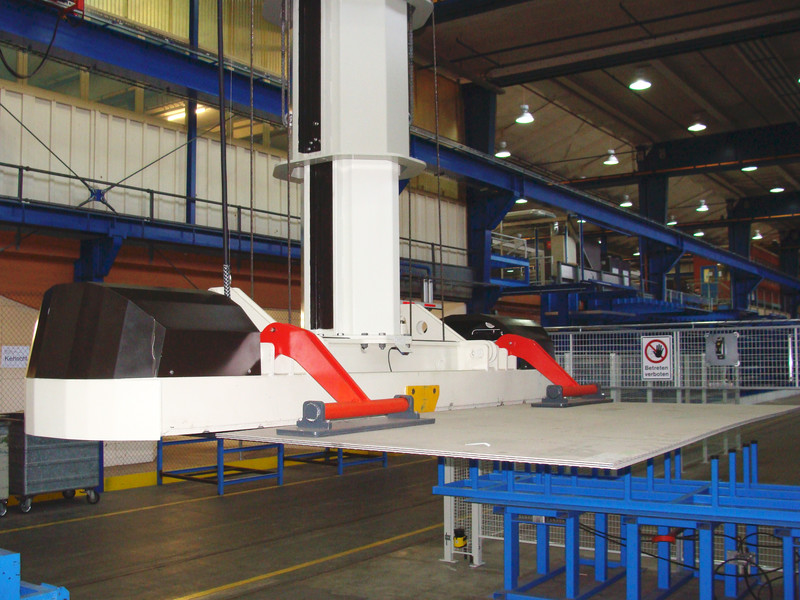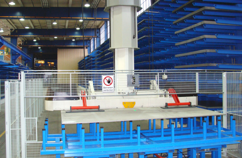 Der als Zweiträger-Brückenkran ausgelegte Stapelkran muss sowohl einen manuellen als auch einen vollautomatischen Betrieb ermöglichen. Der Teleskophubmast dient der Vertikalführung und übernimmt das Drehmoment der Lasten. Die Hubbewegung wird mit einer Seilwinde realisiert. Als Material-Aufnahmegerät ist bei Schindler ein Gabelträger montiert. Die beiden Niederhalter verhindern ein Verrutschen der Bleche im vollautomatischen Betrieb.